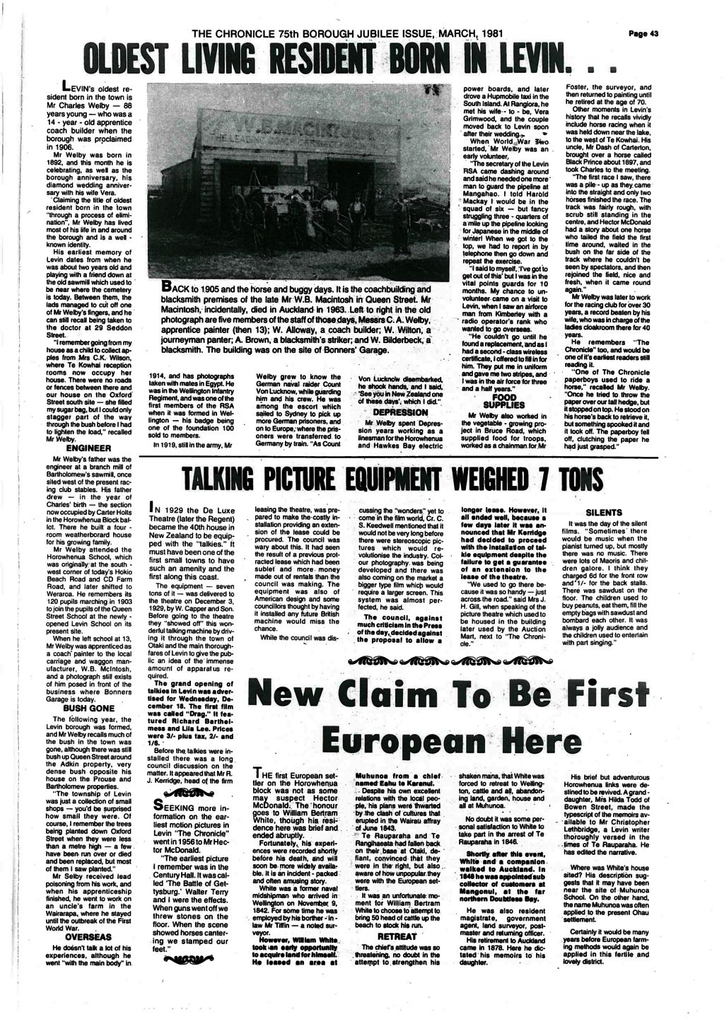 Levin's oldest resident born in the town is Mr Charles Welby-88 years young-who was a 14 year old apprentice coach builder when the borough was proclaimed in 1906.Contains: