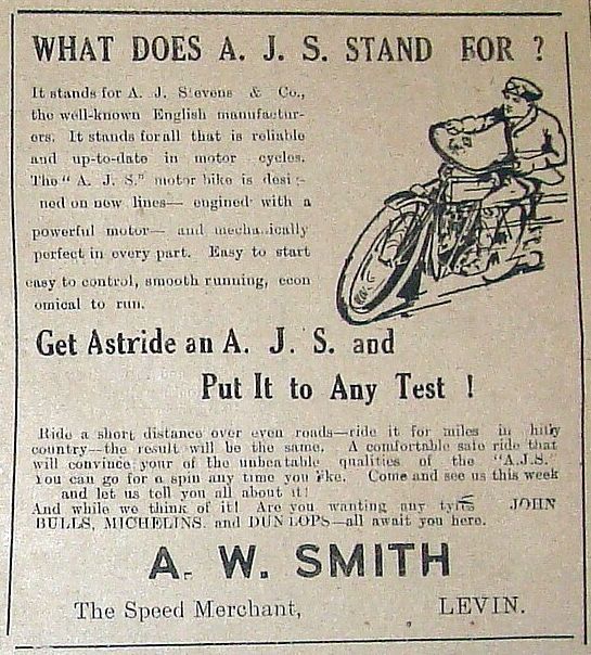 It stands for A.J. Stevens & Co., the well known English manufacturers. It stands for all that is reliable and up-to-date in motor cycles. The “A.J.S.” motor bike is designed on new lines – engined with a powerful motor – and mechanically perfect in every part. Easy to start, easy to control, smooth running, economical to run.