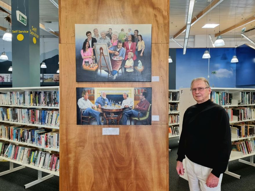 Artist Gordon Norfolk next to his paintings 'Open Day' and ' The Great Debate'.