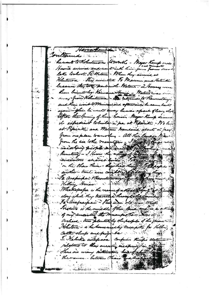 On the other side of Arapaipai is Makahikatea where a cultivation and a place to catch rats. I do not know the roads leading houses to the hills. I know Ngamana as the name of a pole. It was burnt by Muaupoko – Te Pouwhakairo. Hoani Tahu burnt it. We were quarrelling with Ngatihuia. The first pole was pulled up. The second was a carved pole and Muaupoko burnt that.