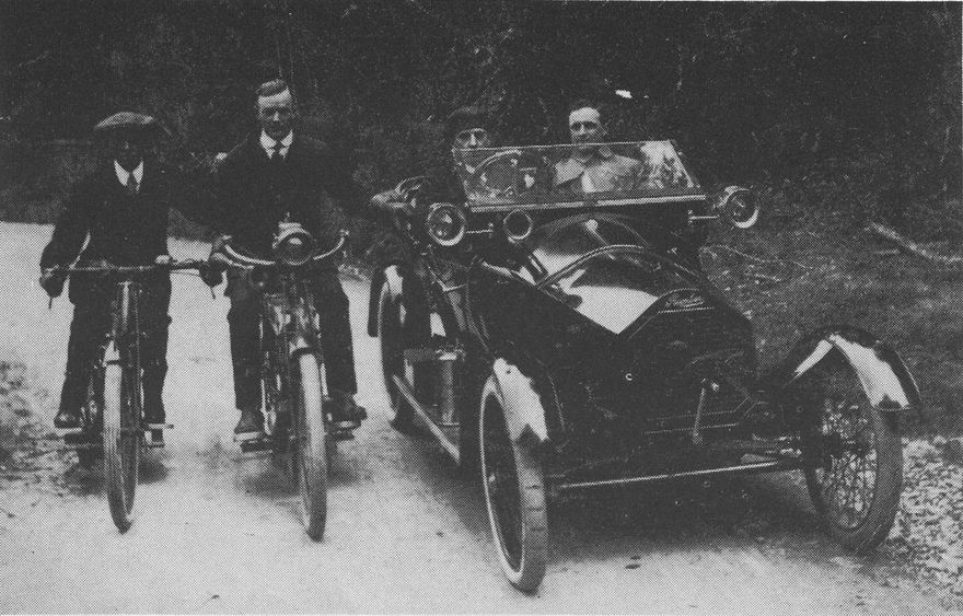 A sporting Humber and two early motor bikes on the road probably in the Avenue, about the early 1920s. Stan Brewster is riding the bike nearest the car.