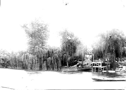 Paiaka settlement in the 1890s, looking from the Manawatu River. Gardner’s house is to the far left of the photograph and is partly obscured by a large weeping willow. The old wharf is in the centre of the photograph. This is now the site of Moutoa Estate Flax Scheme headquarters.