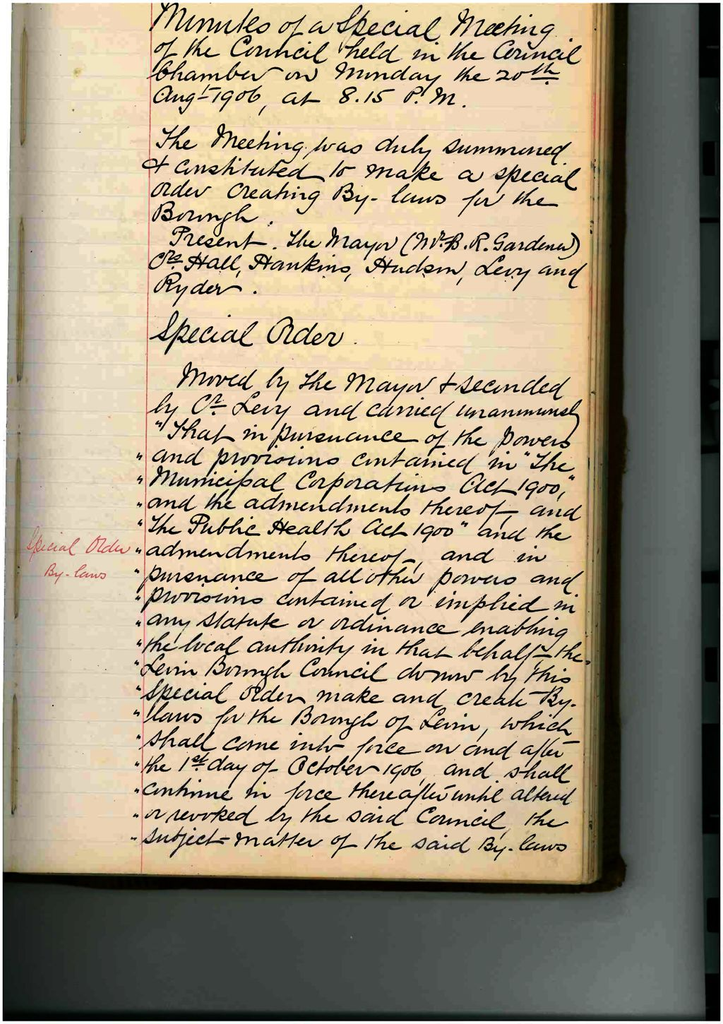Moved by the Mayor and seconded by Cr. Levy and carried unanimously “That in pursuance of the powers and provisions contained in ‘The Municipal Corporations Act 1900’ and the amendments thereof, and ‘The Public Health Act 1900’ and the amendments thereof, and in pursuance of all other powers and provisions contained or implied in any statute or ordinance enabling the local authority in that behalf the Levin Borough Council do now by this Special Order make and create by-laws for the Borough of Levin which shall come into force on and after the 1st day of October 1906, and shall continue in force thereafter until altered or revoked by the said Council, the subject matter of the said by-laws being as follows:
