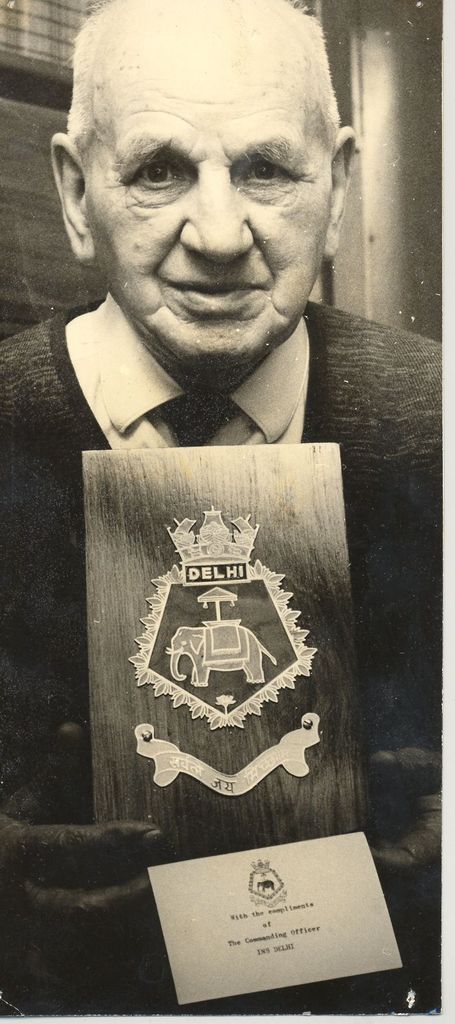 Penciled on back - The Capt. and crew of the Indian cruiser Delhi, formerly the Achilles, honoured the oldest veteran of the ship Mr Charles Bond of the Levin War Veterans Home by presenting him with the ship’s new crest, mounted on Indian cedar wood. Thurs. Oct. 30, 1970. [? 1969 see below]