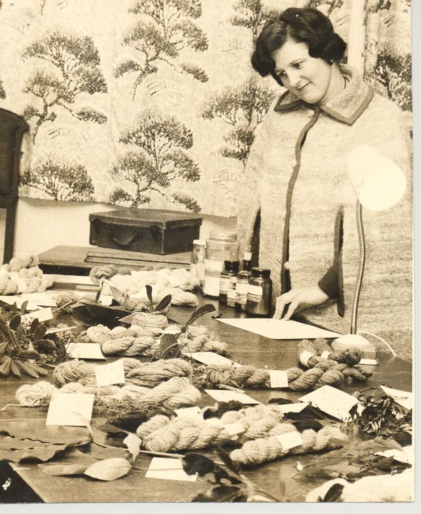 Miss Henderson (lecturer, Massey University), giving a talk to members of the Levin Native Flora Club on “Dying, Spinning and Weaving”.