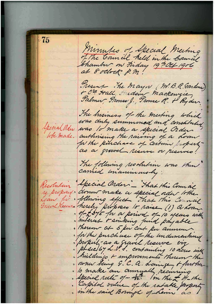 SPECIAL ORDER “That this Council do now make a special order to the following effect – That this Council hereby proposed to raise (1) A Loan of £375 for a period of 10 years with interest and sinking fund payable thereon at 5 per cent per annum for the purchase of the undermentioned property as a gravel reserve – viz: pt.sec 67 LVS containing 10 acres with buildings and improvements thereon the owner being G.C.A. Lainge, and further to make an annually recurring Special Rate of 1/12d. in the £ of the Capital Value of the Rateable property in the said Borough of Levin as security for the interest and sinking fund in connection with the said loan, and (2) further to raise a loan of £375 for a period of 15 years with interest and sinking fund payable thereon at 5 per cent per annum for the purchase of the undermentioned property as a gravel reserve – viz: Pt.sec.26 Block I Waiopehu SD containing 3 acres 1r 28pch. with buildings and improvements thereon, present owner A Corson and further to make an annually recurring special rate of 1/12d. (one twelfth of a penny) in the £ on the capital value of the rateable property in the said Borough of Levin as security for the interest and sinking fund in connection with the said Loan.”