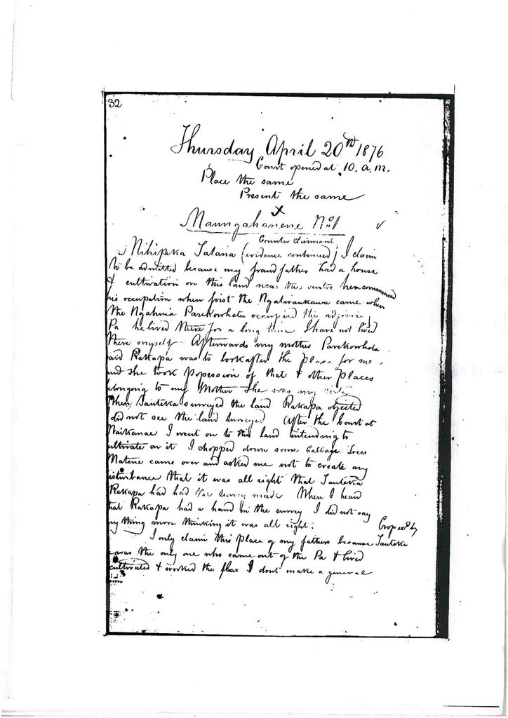 I belong to Ngati Huia and live at Otaki, I know this land I know Mihipara she has an interest in this land through her grandfather’s occupation. I have seen him there, I lived with him there, we had not cultivation we worked at the flax for the purpose of training. The Ngati Huia who went to eat these cabbage trees down. I went to the survey at your request.