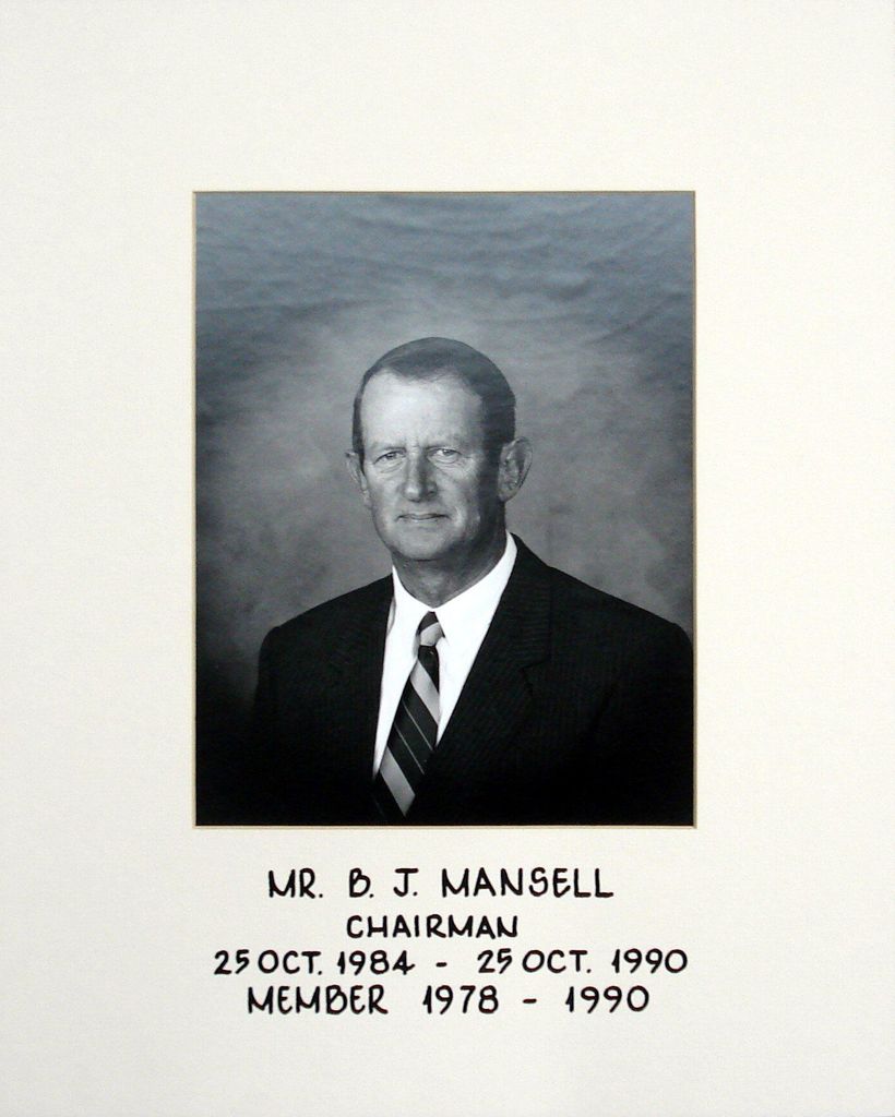 Printed with black ink on mounting board below photo - B.J. Mansell Chairman 25 Oct. 1984 – 25 Oct. 1990 Member 1978 – 1990