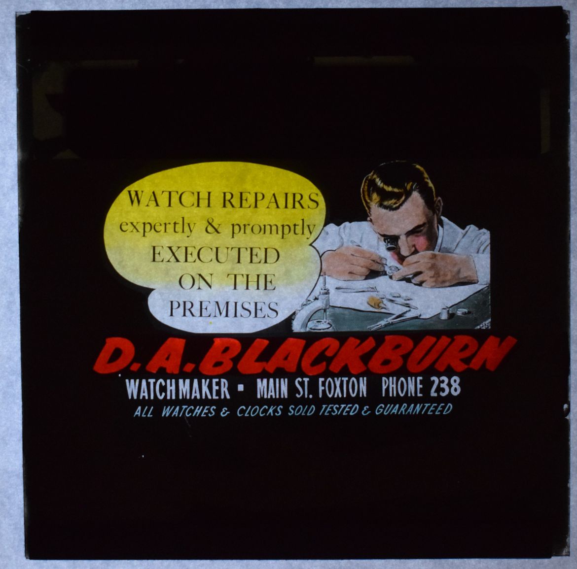 Before the arrival of cheaper watches which are easier to replace than repair, there were many such craftspeople in business. However- maybe Blackburn was too specialized for a town of Foxton's size. Kete records show him in business in 1960 but not in 1955 or 1965, so his shop didn't last as long as many others who took out cinema advertising in Foxton.