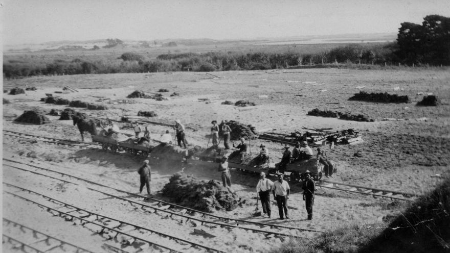 Site preparation for Woolpack and Textiles factory. A number of men stand facing the camera. A horse is pulling a sledge along a set of rails. In the background is the Manawatu River.