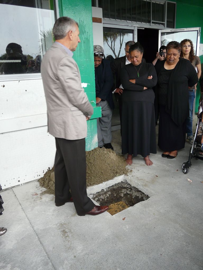 A hole awaits to special rock from the Tararuas - on the morning of the blessing of Te Takere - the new cultural and community centre for Levin.