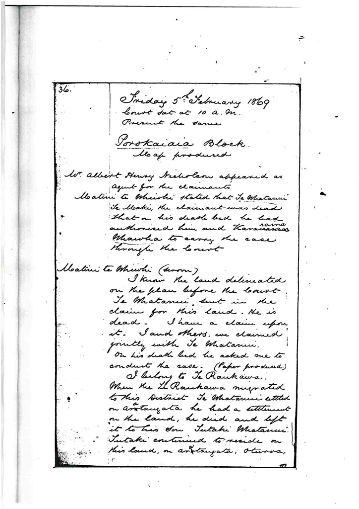 I belong to the Ngati Parewahawaha and reside at Manawatu. I recognize the land shown on the plan before the court. I came to Manawatu from Taupo with the “Heke Wiremu” (first migration). When we came we commenced to subdivide the land. There were three migrations commenced to Kotikotiwhenua after the third. Whatanui went to Manawatu and took a pa there, and took the land. Ngapaki and Rahera had not come at this time, they came afterwards. When I came to Oturoa, there was no one there. I cleared a bush at Wharekawa. I had felled the bush before he came to Oturoa. He had come from Taupo (but was living at Taumatawhiowhio).