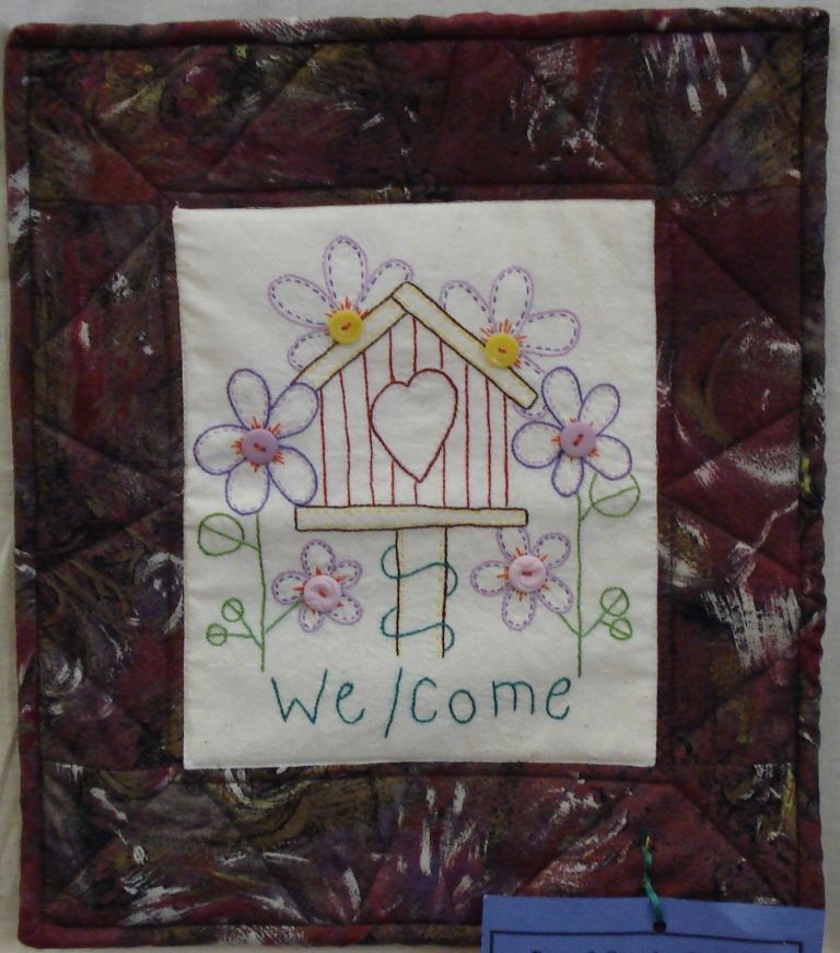 Hand embroidered, a machine pieced and quilted pattern from Homespun magazine. Made by Susan Riley.