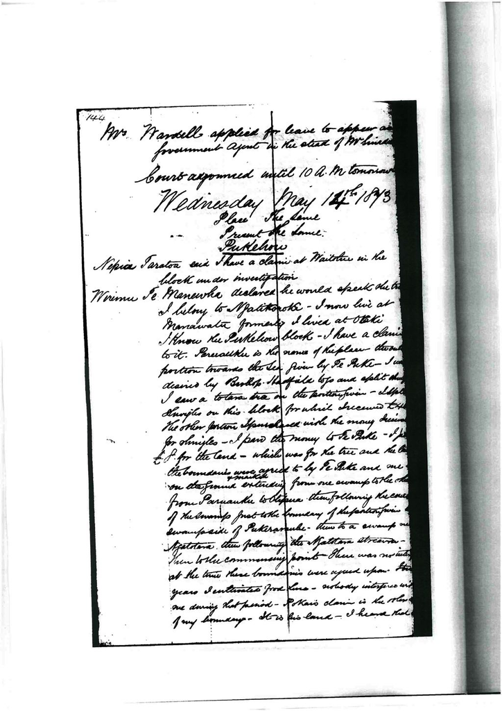 This (Hoani’s) land was paid for in cattle. My piece might be 100 acres. Wi Piti and Te Hau had cultivations beside mine at Paruauku. They belonged to Ngati Pare and Ngati Kauwhata. They did not purchase their land, it was their own.