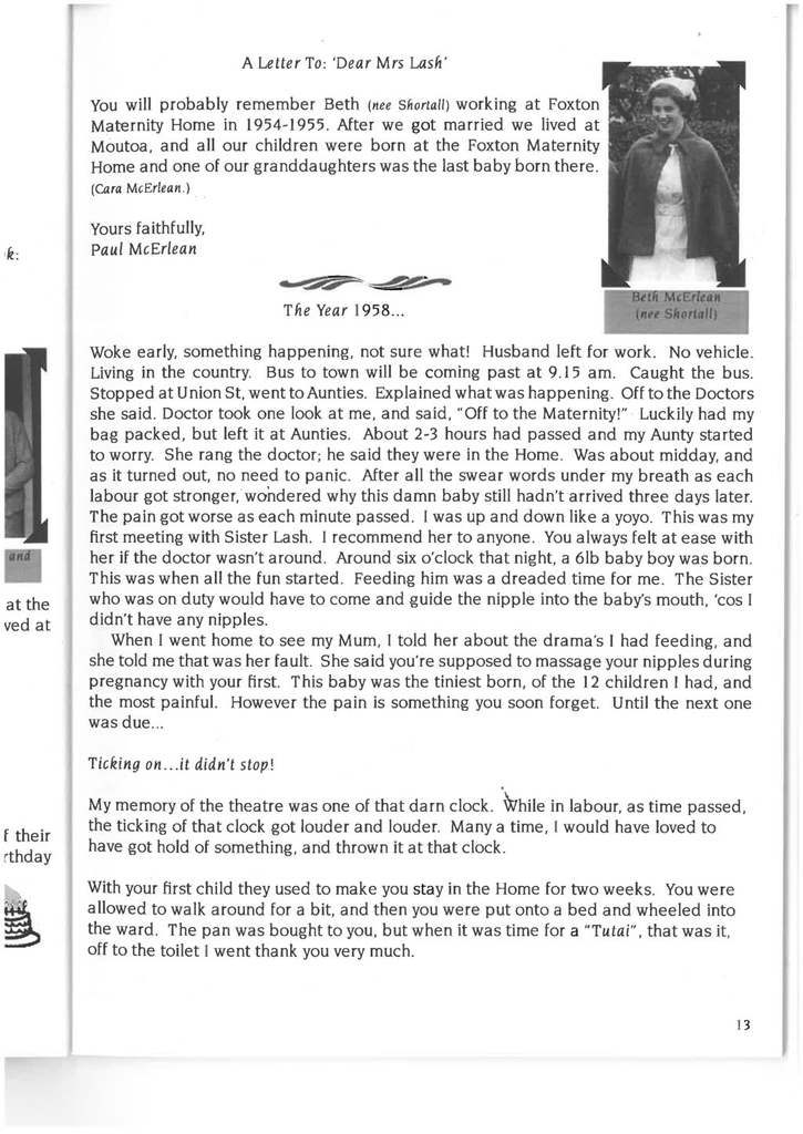 You will probably remember Beth (nee Shortall) working at Foxton Maternity Home in 1954-1955. After we got married we lived at Moutoa, and all our children were born at the Foxton Maternity Home and one of our granddaughters was the last baby born there. (Cara McErlean.)