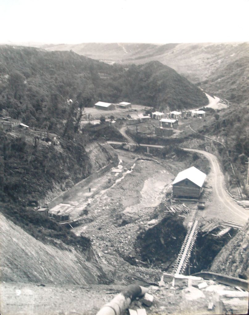 View from above the site, where penstock pipeline is being prepared for placement. Construction (for unknown purpose) on hill (left) above Powerhouse foundations. Part of construction camp (centre) downstream of Powerhouse site, with main camp on plateau at left out of the photo.