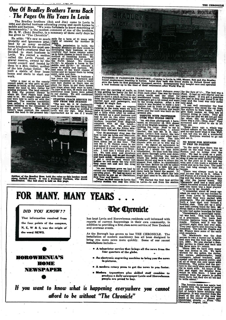 The Bradley brothers (Bob and Jim) came to Levin in 1894 and started business educating young and spoilt horses to saddle and harness. "We were fortunate to know something of horsemanship," is the modest comment of one of the brothers, Mr. R. W. (Bob) Bradley, in a summary of these early days he has given to "The Chronicle".