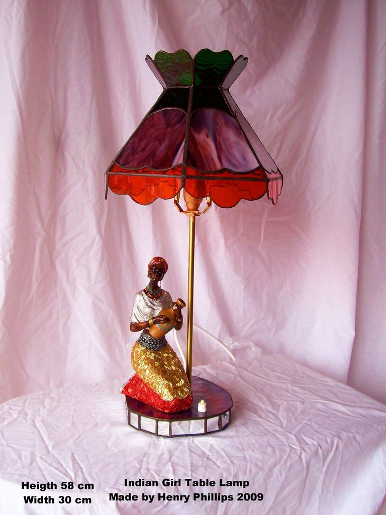 Stained Glass shade mounted on a stained glass base. On - off switch fitted on the base. Indian Lady Statuette ( purchased in Australia ) is permanently fixed to the base.Lamp comes complete with cord and plug.Looks stunning either with light on or off.