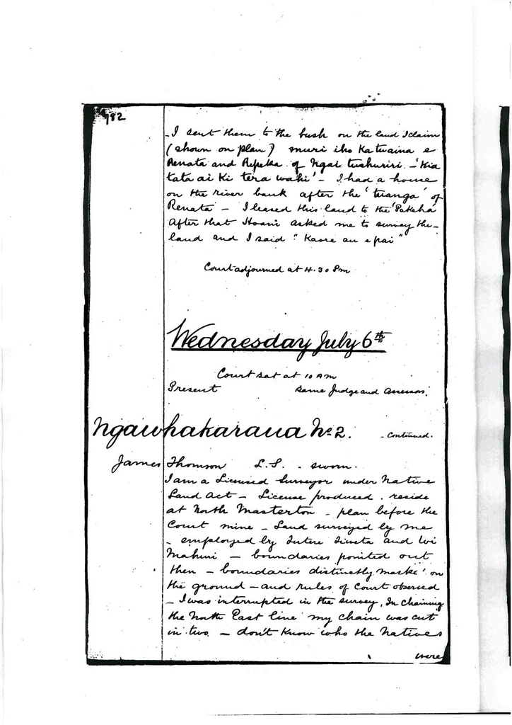 I am a licensed surveyor under Native Land Act. Licensed produced. Reside at North Masterton. Plan before the court is mine. Land surveyed by me. Employed by Tutere Tiweta and Wi Mahuri. Boundaries pointed out then boundaries distinctly marked on the ground and rules of court observed. I was interrupted in the survey, in chaining the north east line my chain was cut in two. Don’t know who the natives were who interrupted me. I understood that the persons interrupting me claimed the land. The north east is I believe the boundary of a claim which has passed the court. I have been paid for survey but not for attendance at court. My claim is £6 – 2 – 0 including attendance at court. I have been paid £4 by employer Tiweta. The road shown on the North West side of the claim is a public road laid off by government and runs through native land. The road running through the land is a private road. The house shown on the plan is the site of a house which has been burnt down. It was occupied by a man named Bennett. The house was burnt down before the survey. There were 2 ‘whare’s on the land when I surveyed the land shown on plan. One was occupied by persons I don’t know. Public road is one chain wide.