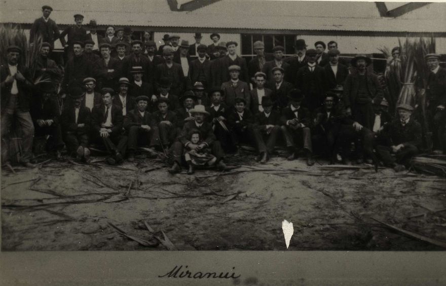 Employees of A & L Seifert’s Flax-dressing Co. Ltd., Miranui, c.1910. This photograph shows a group of mill workers outside a stripping shed. The man in the centre foreground sitting on the ground holding a child, has been identified as Mr R.H. (Dick) Webb, the mill manager. To the left and right of the photograph are bundles of flax leaves.