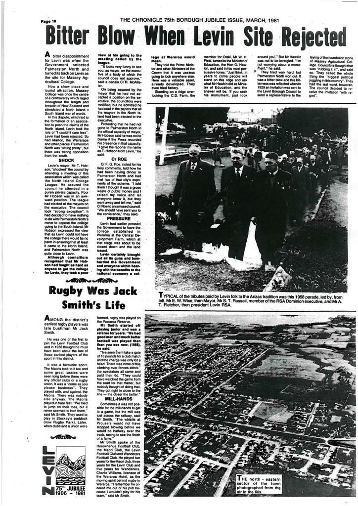 A bitter disappointment for Levin was when the Government selected Palmerston North and turned its back on Levin as the site for Massey Agricultural College.