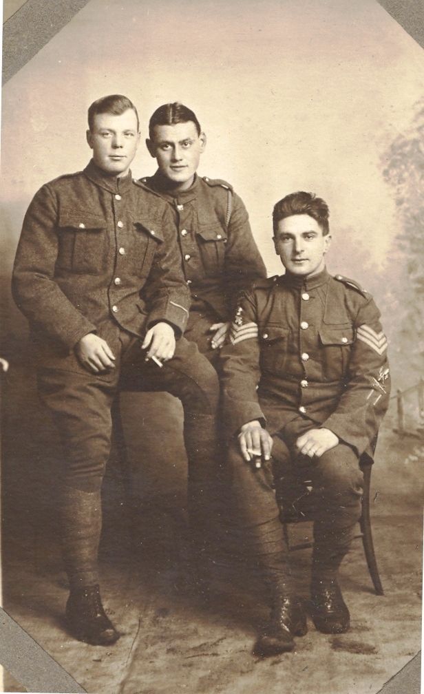 Three soldiers – all are wearing putties and one is a Sargent of unknown Corp. Interestingly they are holding cigarettes in their hands.