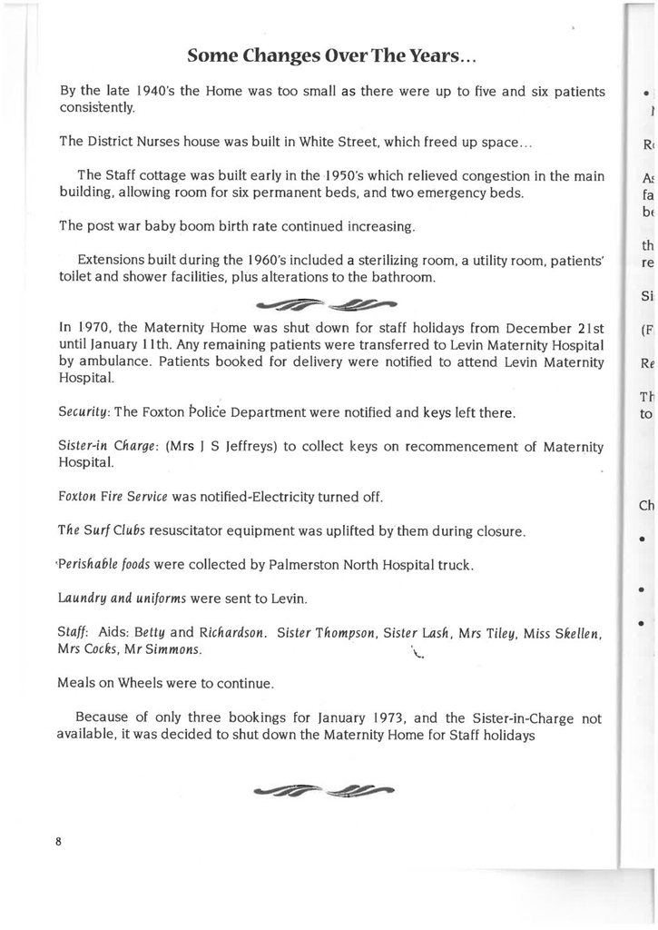 In 1970, the Maternity Home was shut down for staff holidays from December 21st until January 11th. Any remaining patients were transferred to Levin Maternity Hospital by ambulance. Patients booked for delivery were notified to attend Levin Maternity Hospital.
