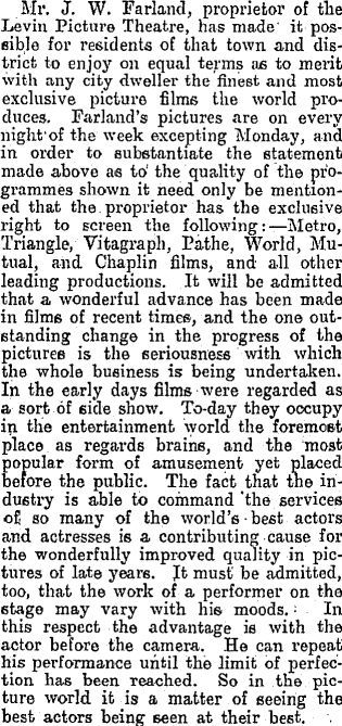 Mr. J. W. Farland, proprietor of the Levin Picture Theatre, has made it possible for residents of that town and district to enjoy on equal terms as to merit with any city dweller the finest and most exclusive picture films the world produces. Farland's pictures are on every night of the week excepting Monday, and in order to substantiate the statement made above as to the quality of the programmes shown it need only be mentioned that the proprietor has the exclusive right to screen the following:—Metro, Triangle, Vitagraph, Pathe, World, Mutual, and Chanlin films, and all other leading productions. It will be admitted that a wonderful advance has been made in film of recent times, and the one outstanding change in the progress of the pictures is the seriousness with which the whole business is being undertaken. In the early days films were regarded as a sort of side show. To-day they occupy in the entertainment world the foremost place as regards brains, and the most popular form of amusement yet placed before the public. The fact that the industry is able to command the services ofj so many of the world's best actors and actresses is a contributing cause for the wonderfully improved quality in pictures of late years. It must be admitted, too, that the work of a performer on the stage may vary with his moods. In this respect the advantage is with the actor before the camera. He can repeat his performance until the limit of perfection has been reached. So in the picture world it is a matter of seeing the best actors being seen at their best.