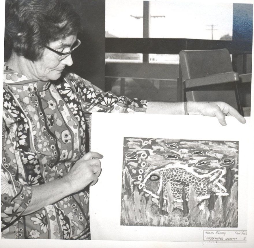 “Underwater Secrets” painting by Miss Alison Allerby of Fairfield School, being held by the vice president (unnamed) of the Levin Arts Society. 1 B&W photo print