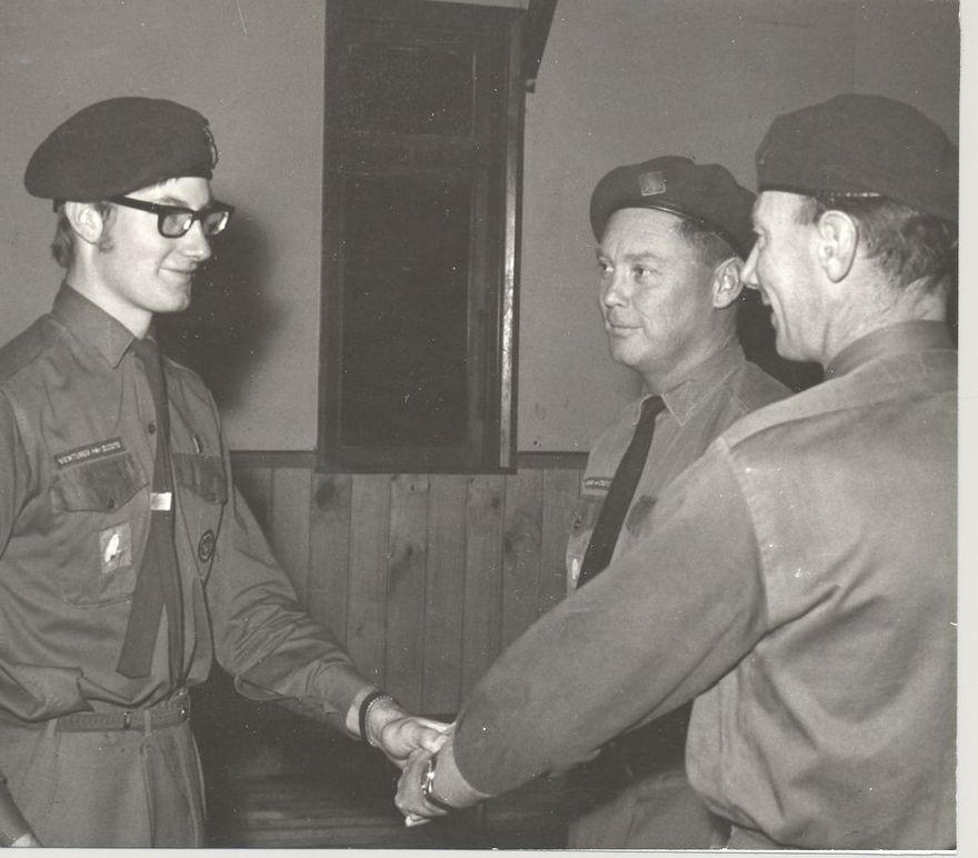 Venturer Ross Hewett (left) being congratulated by District Commissioner J. Morrison (right) and Venturer Advisor, Mr I. Wenham (centre), on his attaining the Queen’s Scout Award, the highest in Scouting.