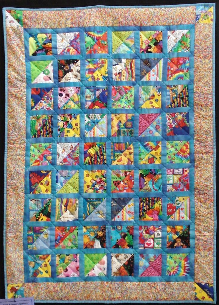 Cot quilt - machine pieced and quilted from squares of a charm square swap. Made by Janneke de Vries.