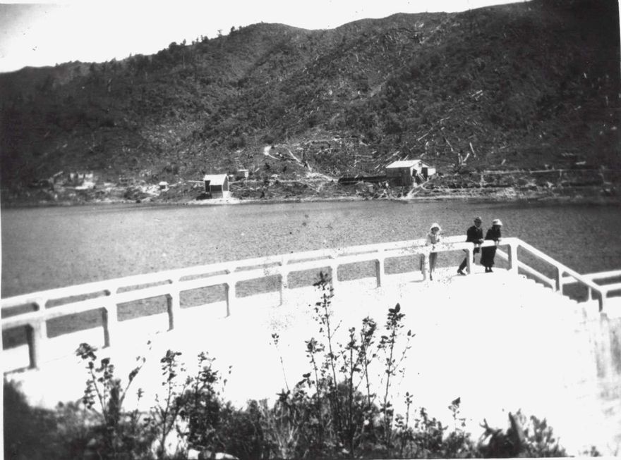 3 people (unidentified – man & 2 women) standing on the dam looking downstream. Some wooden buildings can be seen (background) near shore of reservoir behind dam.