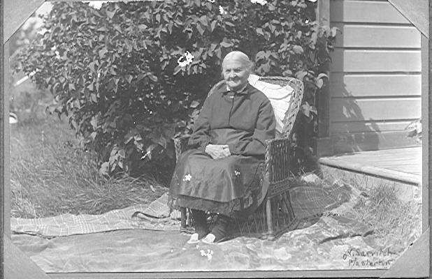 Mrs Jane Harrison aged 91 years, of Martinborough, Wairarapa. Mrs Harrison was the mother of Mrs John Cameron of Shannon and Levin. In this photograph Mrs Harrison sits in a wicker chair which has been placed on rugs outside a house, and in front of a large bush.