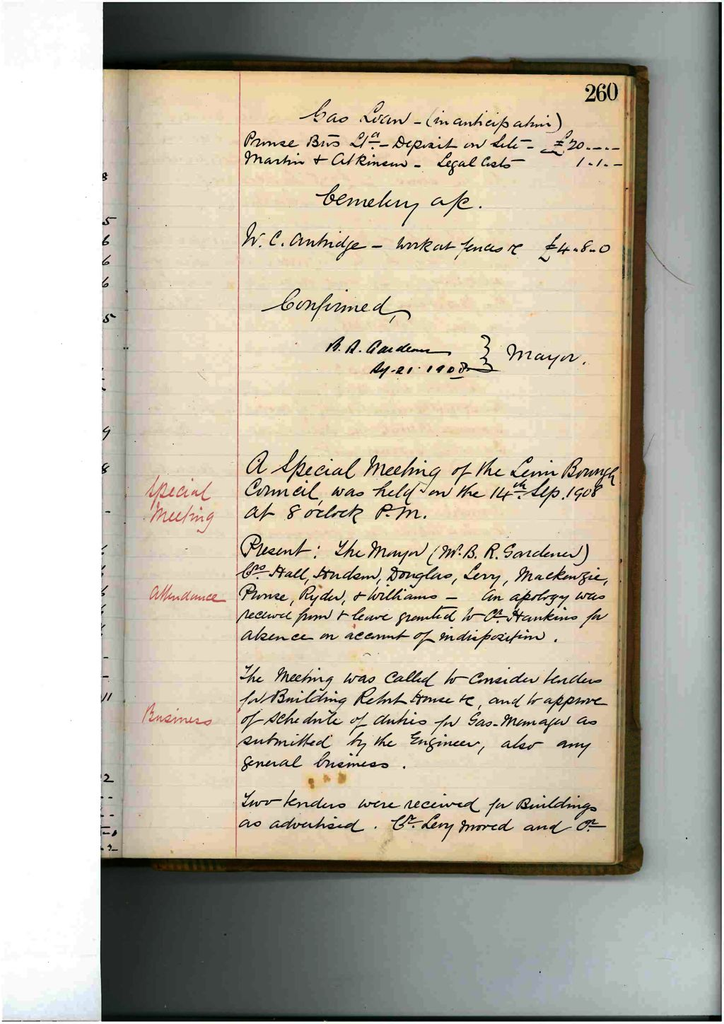 Present :The Mayor (Mr. B.R. Gardener) Crs. Hall, Hudson, Douglas, Levy, MacKenzie, Prouse, Ryder & Williams – an apology was received from and leave granted to Cr. Hankins for absence on account of indisposition.