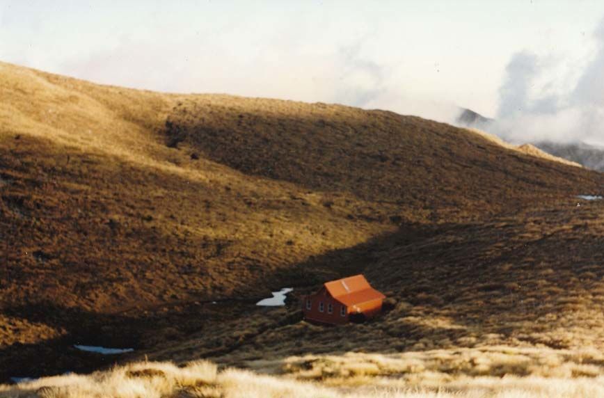 Kime Hut in the Tararua Ranges. One of the coldest places in the Tararua Forest Park. It has no form of heating, and it is not unusual to have snow on it even in summer. A view of the hut from Hut Mound