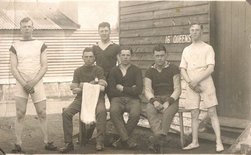 Group of six men two are in sports wear – could be cross country runners. One man is holding a towel. 16 Queens can be seen written on the building behind.