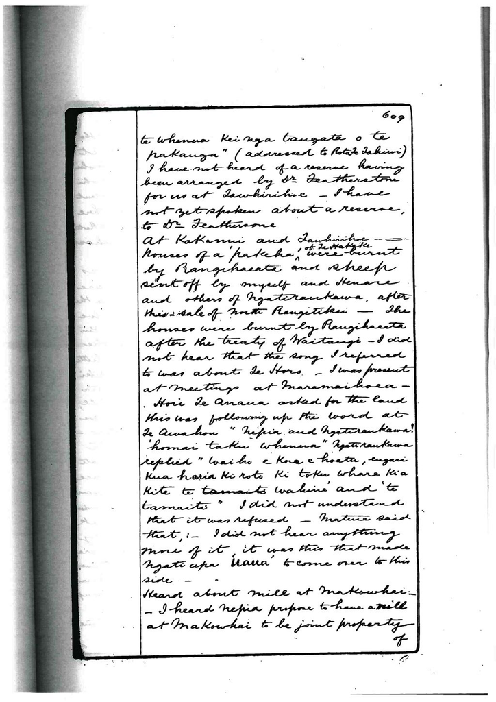 At Kakanui and Tawhirihoe, houses of a ‘pakeha’ of Te Hakeke were burnt by Rangihaeata and sheep sent off by myself and Henare and others of Ngatiraukawa. After this sale of north Rangitikei, the houses were burnt by Rangihaeata after the treaty of Waitangi. I did not hear that the song I referred to was about Te Horo. I was present at meetings at Maramaihoea. Hori Te Anaua asked for the land this was following up the word at Te Awahou “Nepia and Ngatiraukawa homai taku whenua” Ngatiraukawa replied “waiho e dore e hoatu, engari kua haria ki roto ki toku whare ki a kite te wahine” and “te tamaiti”. I did not understand that it was refused. Matene said that, I did not hear anything more of it, it was this that made Ngatiapa ‘uaua’ to come over to this side.