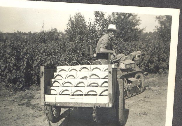 A man driving a tractor (has tracks instead of wheels) towing a trailer that has containers of fruit on it. The fruit could be tomatoes?
