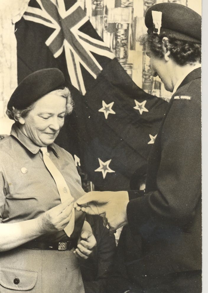 Mrs R. P. Howell (left) receives her long service award from the Divisional Commissioner, Mrs W.F. Doreen (right), after 15 years service with the St Mary’s Brownies.