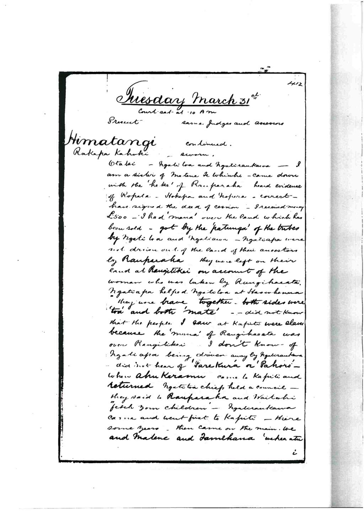 Rakapa Kahoki – sworn – Otaki – Ngati Toa and Ngatirauka – I am a sister of Matene Te Whiwhi – came down with the ‘heke’ of Rauparaha – heard evidence of Ropata – Hohepa and Nopera – correct – have signed the deed of cession – I received money £500 – I had ‘mana’ over the land which has been sold – got by the ‘patunga’ of the tribes by Ngati Toa nad Ngati Awa – Ngati Apa were not driven out of the land of their ancestors by Rauparaha – they were left on their land at Rangitikei on account of the woman who was taken by Rangihaeata – Ngati Apa helped Ngati Toa at Haowhenua – they were brave together – both sides were ‘toa’ and both ‘mate’ – did not know that the people I saw at Kapiti were slaves because the ‘mana’ of Rangihaeata was over Rangitikei – I don’t know of Ngati Apa being driven away by Ngatiraukawa – did not hear of ‘parekura’ or ‘pahoro’ – when Ahu Keramu came to Kapiti and returned – Ngati Toa chiefs held a council – they said to Rauparaha and Waitohi “fetch your children” – Ngatiraukawa came and went first to Kapiti – there some years – then came on the main – we and Matene and Tamihana ‘wehea atu