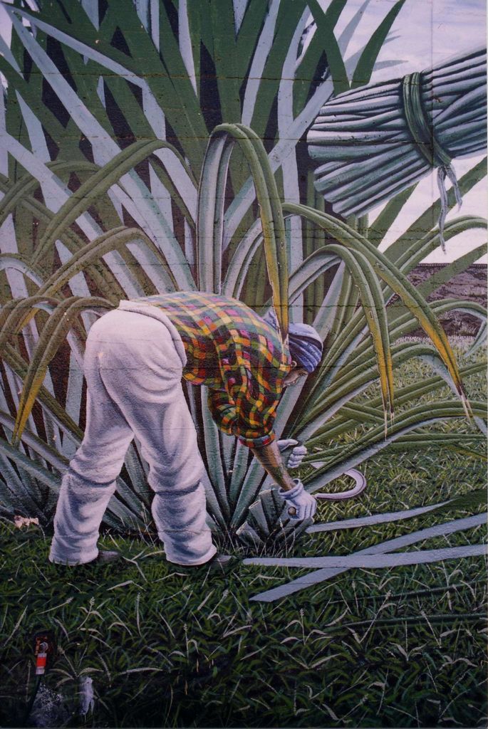Foxton mural depicting Bill Stretch cutting flax for the Foxton flax stripper which was first operational in 1869 and closed in the 1970’s