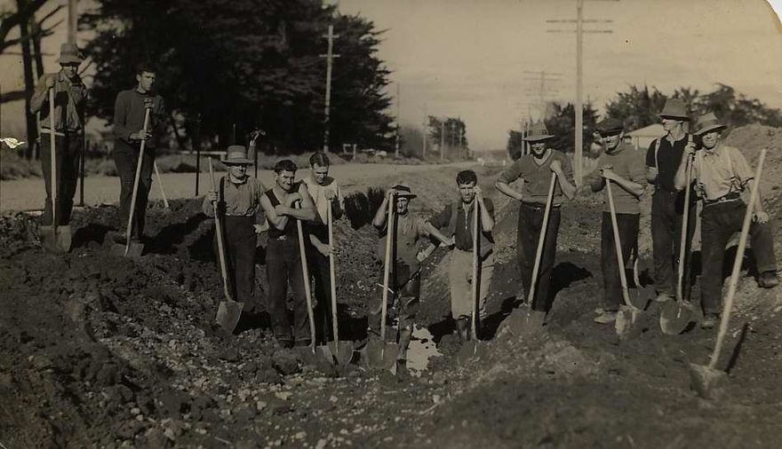 A group roup of men digging alongside Levin Road, south of Foxton> the man third from the left in this photograph is Roy Andresen.
