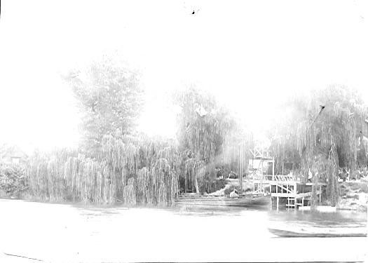 Paiaka settlement in the 1890s, looking from the Manawatu River. Gardner’s house is to the far left of the photograph and is partly obscured by a large weeping willow. The old wharf is in the centre of the photograph. This is now the site of Moutoa Estate Flax Scheme headquarters.