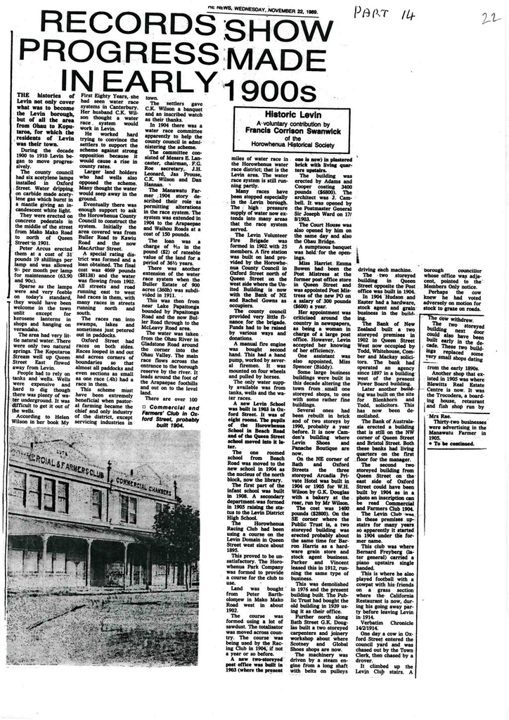 The histories of Levin not only cover what was to become the Levin borough, but all of the area from Ohau to Koputaroa, for which the residents of Levin was their town.