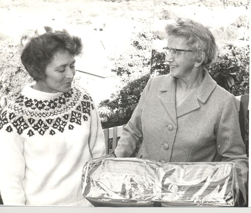 Woman (unidentified, left) wearing knitted wool jersey, light colour with dark pattern around top. Older woman (unidentified, right) wearing glasses and holding electric blanket ? in its clear vinyl plastic bag (presenting or receiving ?).