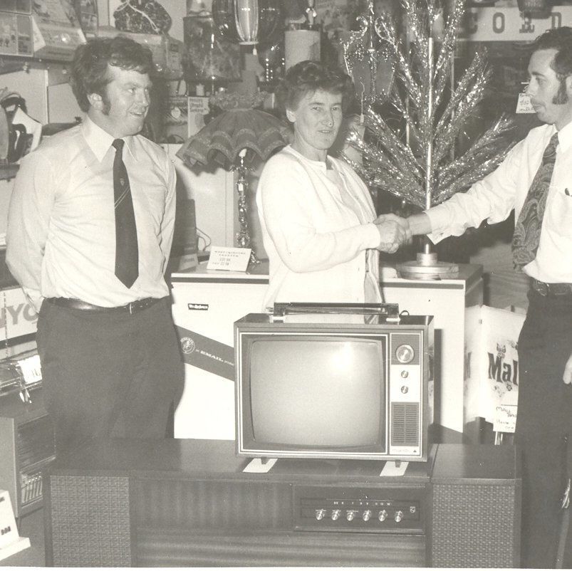 Penciled on back - Levin Jaycee 1972 Spelrite competition. Levin Jaycee Pres. Mr Brendan Molloy (left) and the project convenor, Mr Paul Kerslake (right, watch as the first prizewinner, Mrs B.W. Anyan is congratulated by Mr J. Pye whose firm donated first prize. Thurs. Dec. 21, 1972.