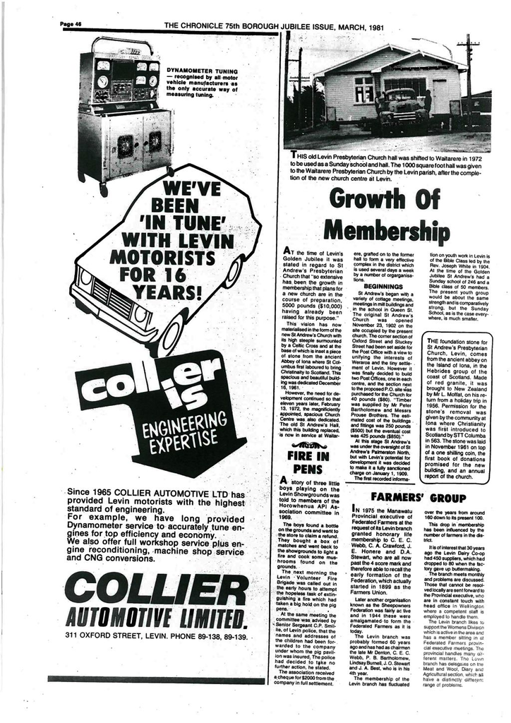 At the time of Levin's Golden Jubilee it was stated in regard to St Andrew's Presbyterian Church that "so extensive has been the growth in membership that plans for a new church are in the course of preparation, 5000 pounds ($10,000) having already been raised for this purpose."Contains: