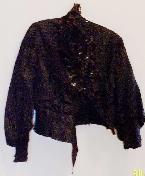 High necked, long sleeved black satin top with sequins and lace. It appears to be 1/2 deconstructed. Yoke features rows of pin tucks.