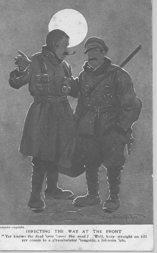 Directing the way at the front. “Yer knows the dead ‘orse ‘cross the road? Well, keep straight on till you comes to a p’rambulator ‘lonside a Johnson ‘ole.