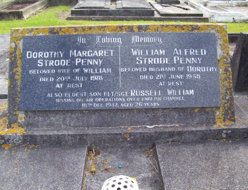Loving memory of William Alfred STRODE-PENNY beloved husband of Dorothy died 21 June 1958. Dorothy Margaret STRODE-PENNY beloved wife of William died 20 July 1978 also eldest son Flt/Sgt Russell William STRODE-PENNY missing on air operations over English Channel 18 December 1942 aged 26 years.